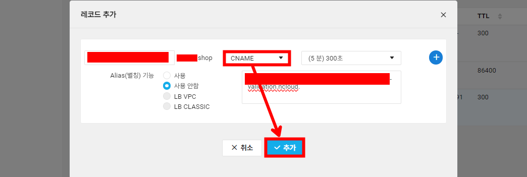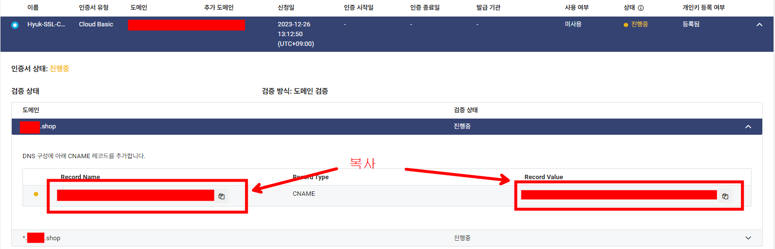 다음과 같이 DNS 검증을 할 때 주의하셔야 할 사항은 [도메인 이름] 값을 그대로 복사 붙여 넣기 하는 것이 아닌. domain.shop 부분을 제외한 나머지 값을 입력하셔야 합니다. 실패 시 유효한 레코드가 아니어서 등록이 되지 않습니다.