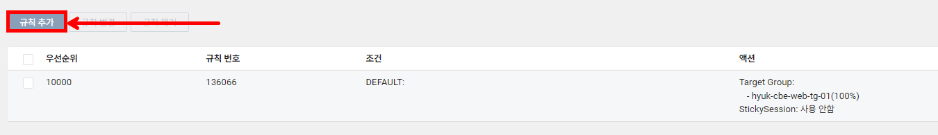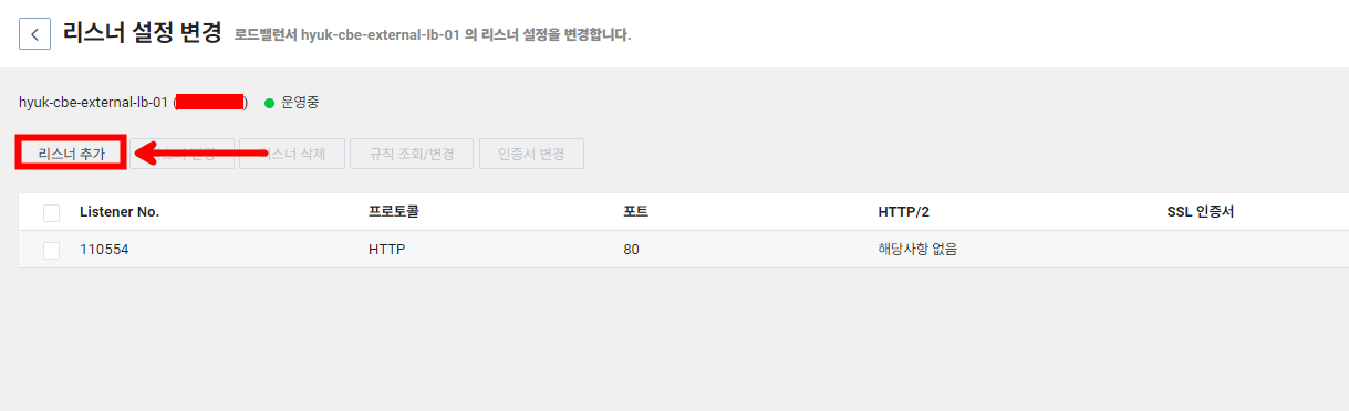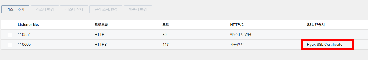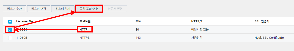 다음과 같이 HTTP 프로토콜 리스너에 대해 [규칙 조회/변경] 버튼을 누릅니다. 엔드 유저가 80으로 들어왔을 때 443으로 리다이렉트 해주기 위함입니다.