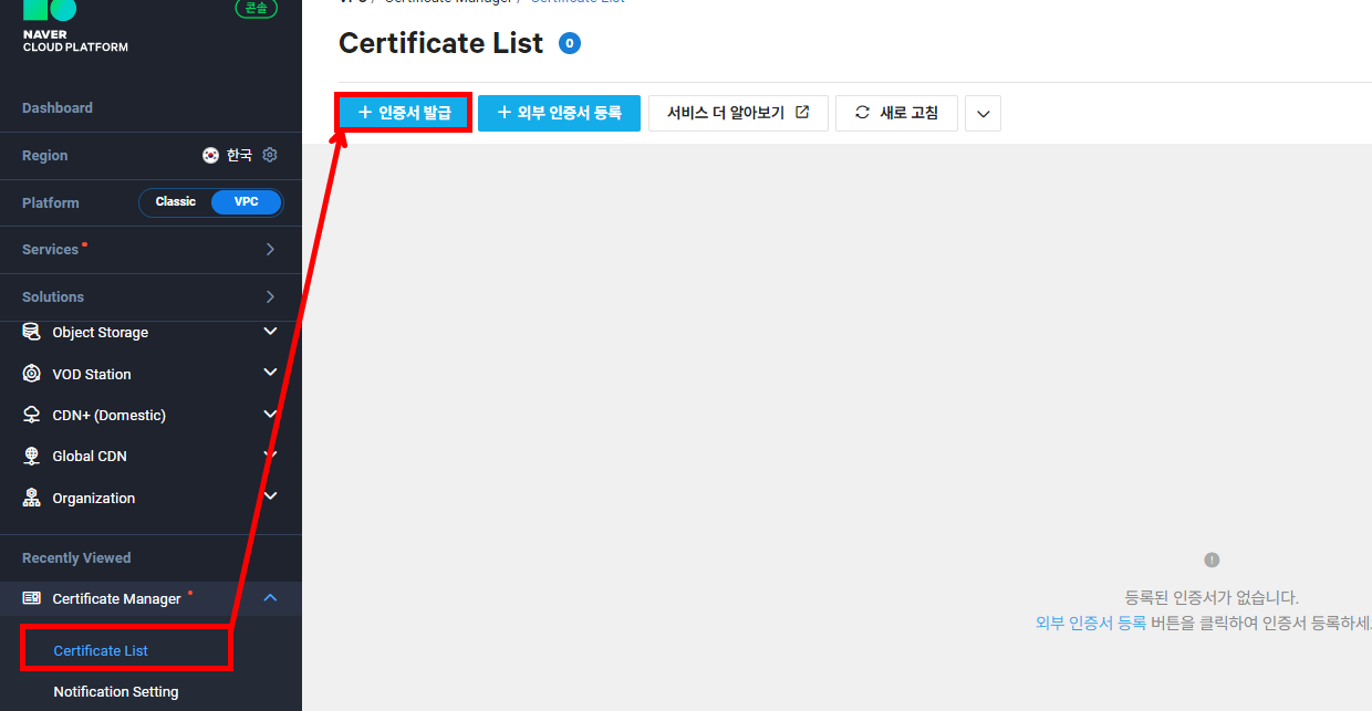 현재 등록된 인증서가 없기 때문에 신규 기능으로 추가된 인증서 발급을 통해 SSL 인증서를 발급하겠습니다.