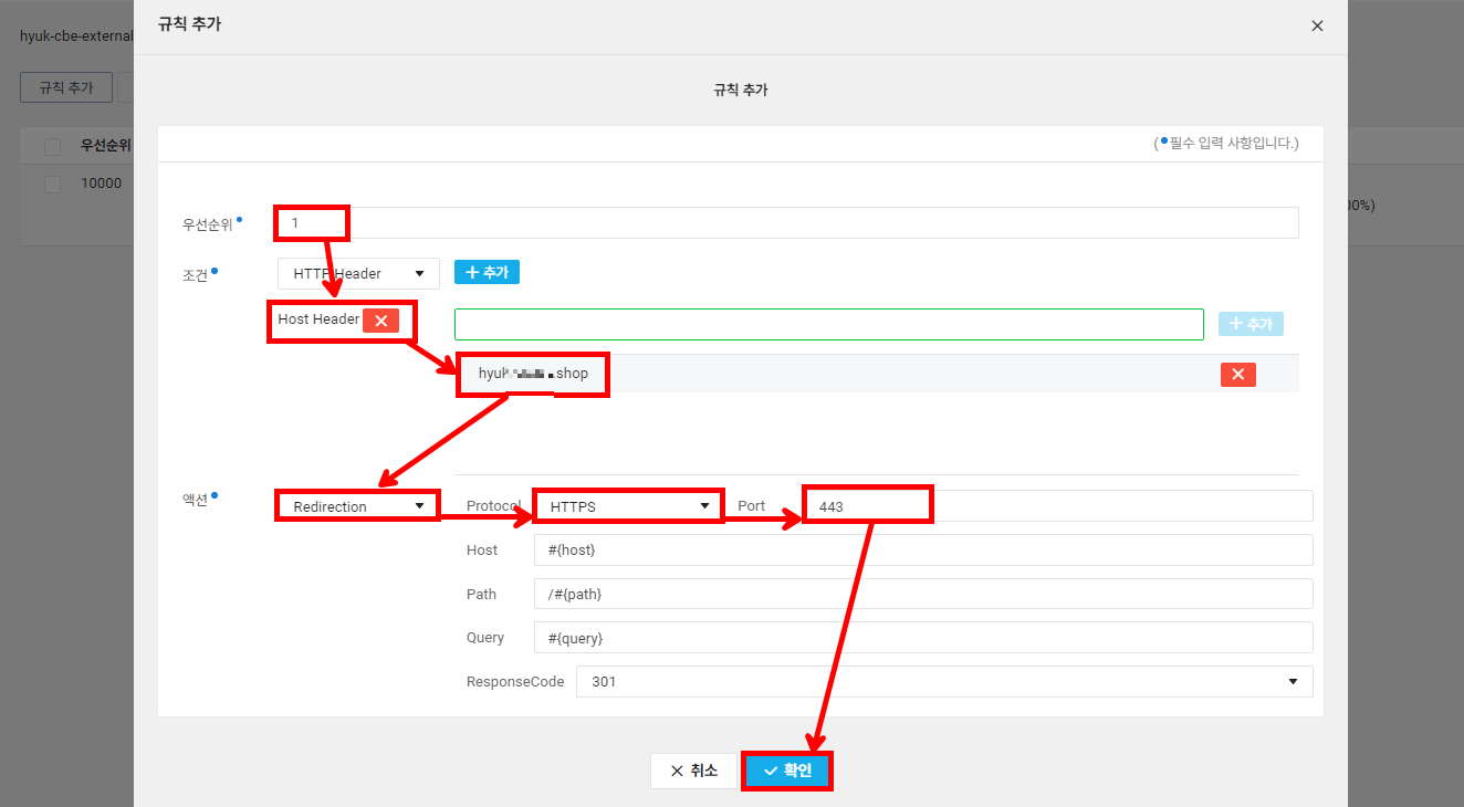 다음과 같이 호스트 헤더가 hyuk.domain.shop에 대해 HTTPS 443으로 리다이렉트 하는 액션을 하는 규칙을 추가합니다.
