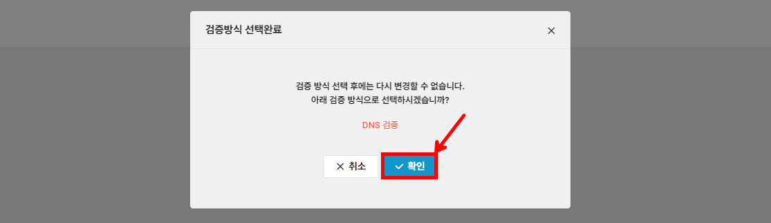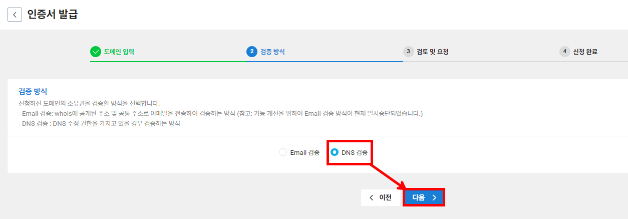 저는 DNS 검증을 이용하여 도메인의 소유권을 검증하도록 하겠습니다. 본인이 편한 방법으로 인증을 진행해 주시면 됩니다.