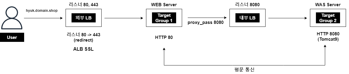 최종적으로 다음과 같이 엔드 유저가 도메인을 통해 접속했을 때 리스너 80의 우선순위인 80 ▶ 443으로 리다이렉트 되고 SSL이 적용됩니다. 나머지 뒷단은 내부 네트워크 통신이기 때문에 HTTP로 평문 통신하게 됩니다.