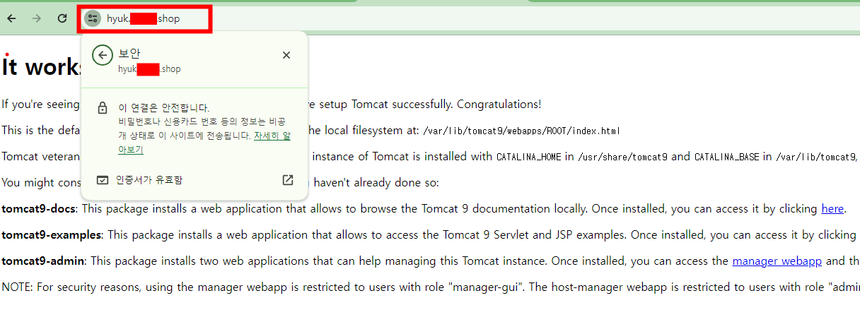Global DNS에 등록한 도메인을 통해 다음과 같이 브라우저에서 접속하면 SSL 인증서가 적용되어 보이는 것을 확인할 수 있습니다.