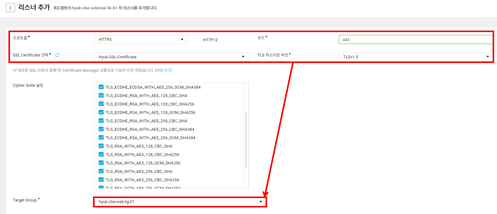 다음과 같이 등록한 인증서를 추가한 후 HTTPS/443/TLSv1.0/Target Group를 입력한 후 저장합니다.
