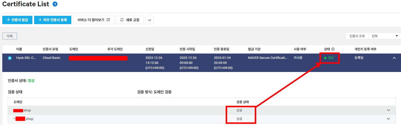 배포한 후 약간의 시간 차가 있겠지만 다음과 같이 검증 상태가 [성공]으로 바뀌고 상태는 정상으로 바뀌게 됩니다. 다음과 같이 DNS 검증이 완료되었다면 등록한 SSL 인증서를 사용하실 수 있습니다.