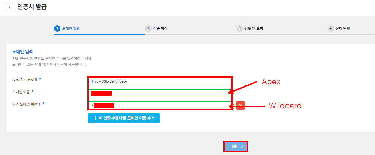 테스트를 위해 사용할 도메인을 등록합니다. 저는 현재 domain.shop이라는 테스트 도메인이 있기 때문에 다음과 같이 설정한 후 다음을 눌러줍니다.