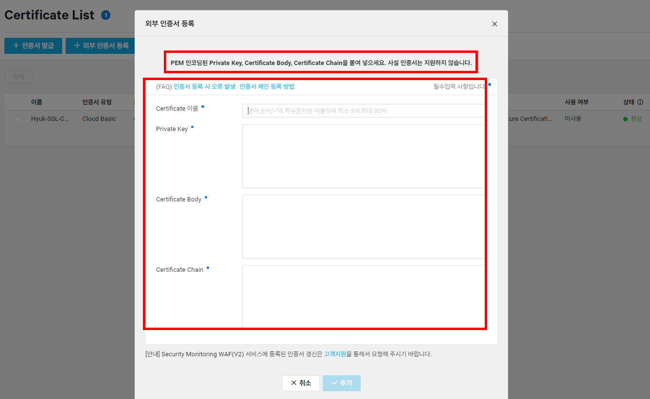 외부 인증서를 등록할 때 주의해야 할 사항이 있습니다.