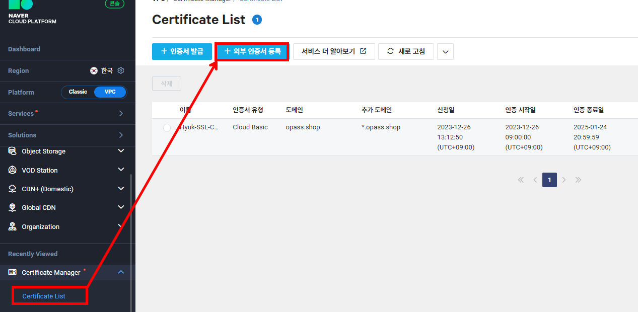 이번 시간에는 네이버 클라우드 플랫폼 Certificate Manager를 통한 외부 인증서 등록하는 방법과