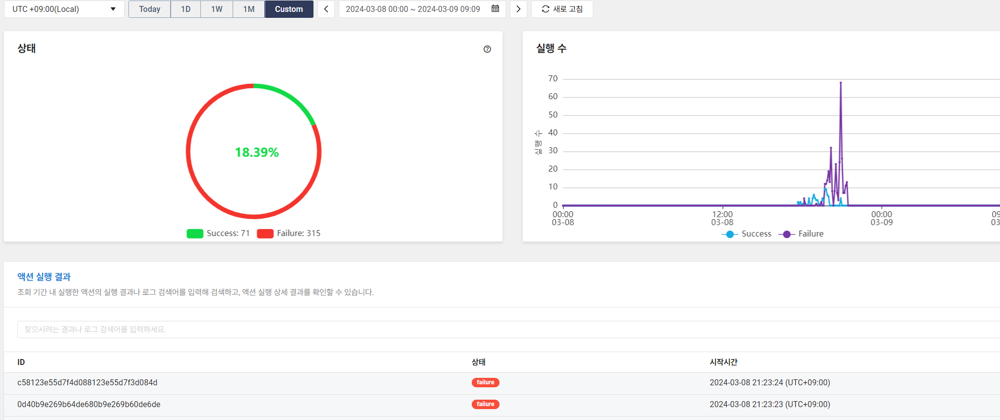 다음과 같이 Action을 실행해볼 수 있습니다. 응답 값은 즉시 받을 수 있으며 실행 성공 여부는 [모니터링] 탭에서 확인하실 수 있습니다.