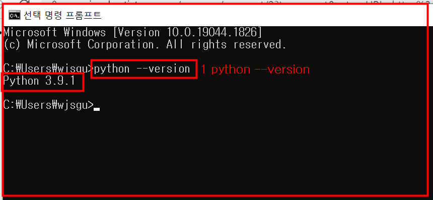 파이썬이 정상적으로 설치되었는지 확인해봅니다. Python 3.9.1이 출력된다면 파이썬이 정상적으로 설치된 것입니다.