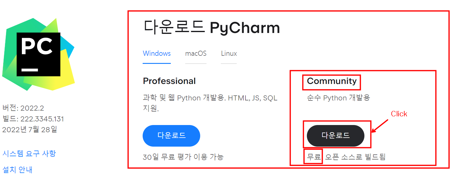 Pro 버전은 더 다양한 기능을 제공해주지만 30일 체험 후 유료입니다. 무료 버전인 Community 버전을 설치합니다.