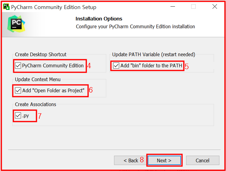 (각각 바탕화면 아이콘 생성 여부, 환경 변수 업데이트, 프로젝트 열기 메뉴, 파이썬 파일 생성 등)