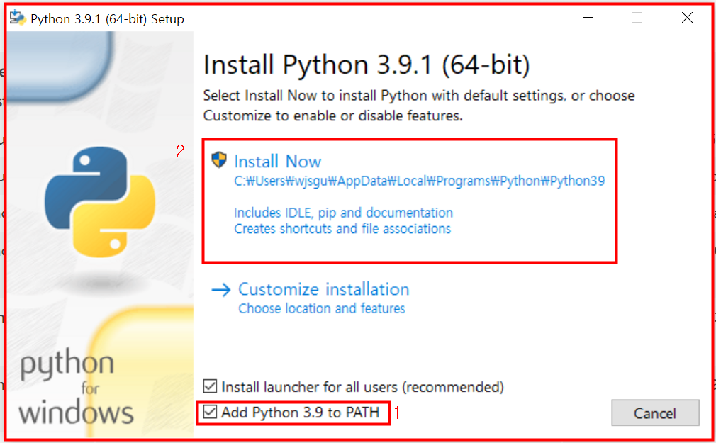 설치할 파이썬 경로를 자동으로 잡아주기 위해 Add Python 3.9 to PATH를 꼭 체크하신 후 넘어가 주세요.