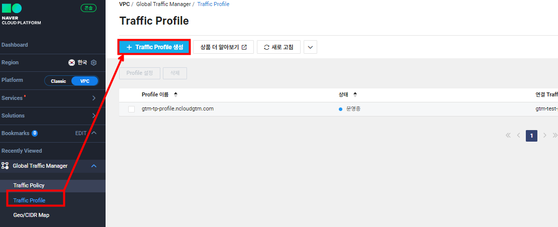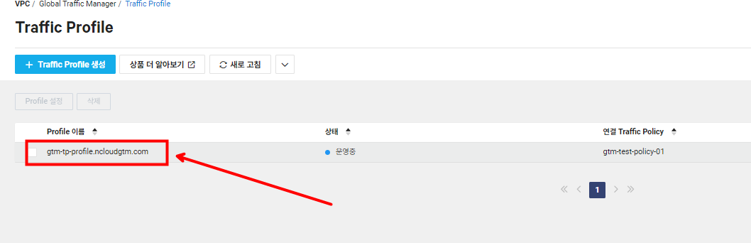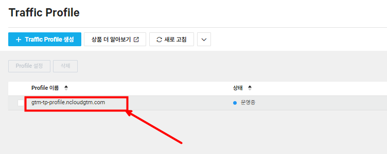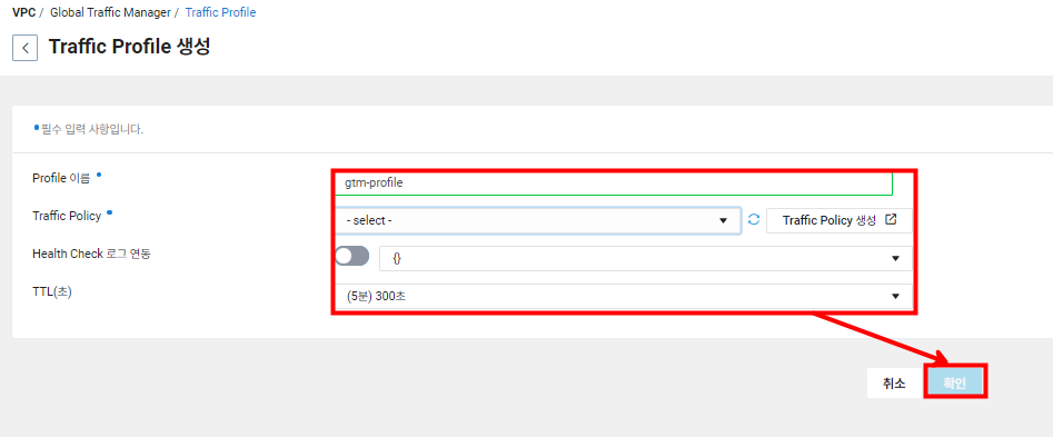 Traffic Profile은 앞서 생성한 Traffic Policy를 적용하여 GTM 도메인을 제공합니다. 다음과 같이 프로필 이름을 설정하고 정책을 선택한 후 확인을 누르면 적용됩니다.