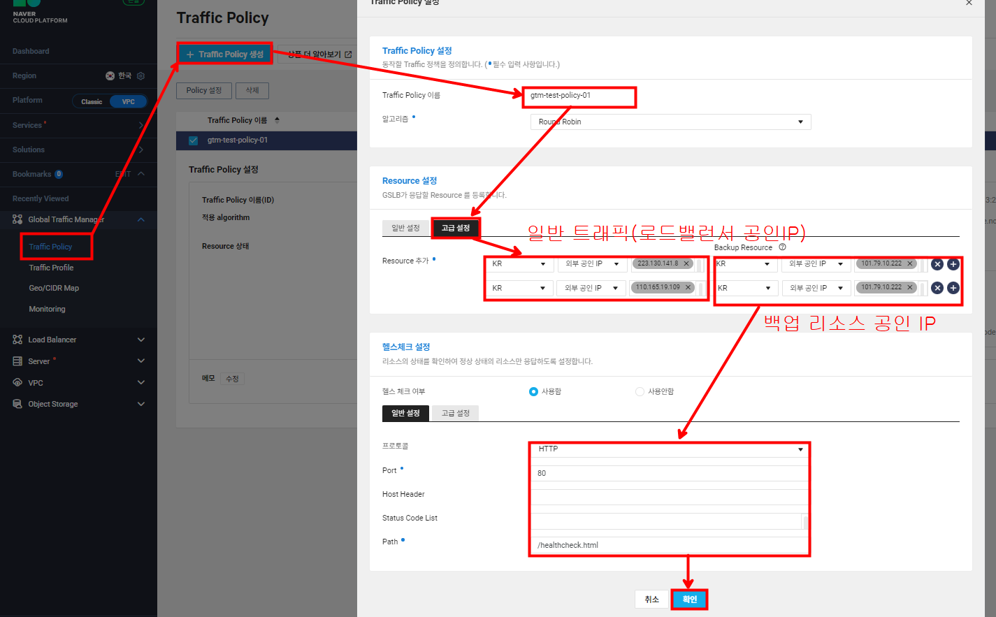 Global Traffic Manager에서 정책 생성 시 Load Balancer의 공인 IP가 필요하기 때문에 로드밸런서 생성 시 공인 IP를 추가해야 합니다.