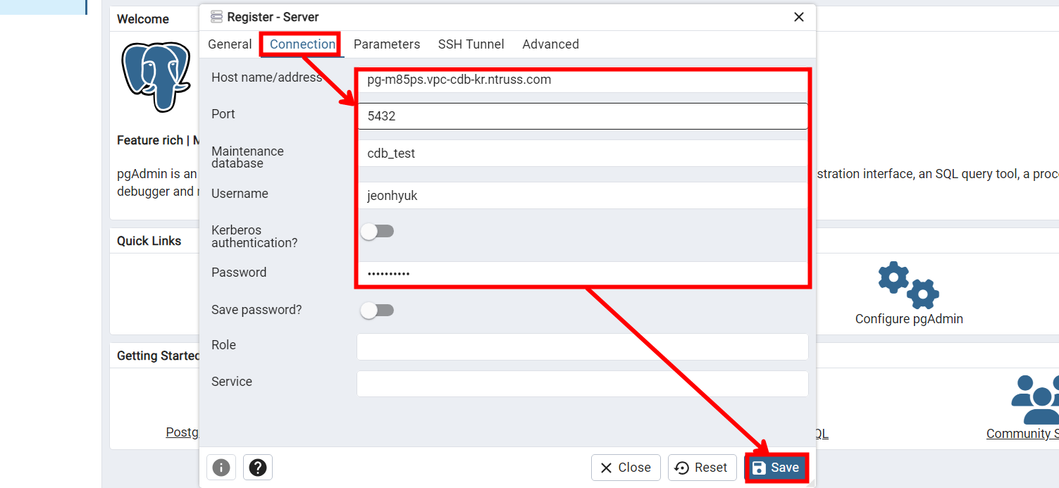 서버 이름과 DB Connection 정보를 입력한 후 [Save]를 눌러줍니다. 이때 Host는 Private 도메인을 입력해 주시면 됩니다.