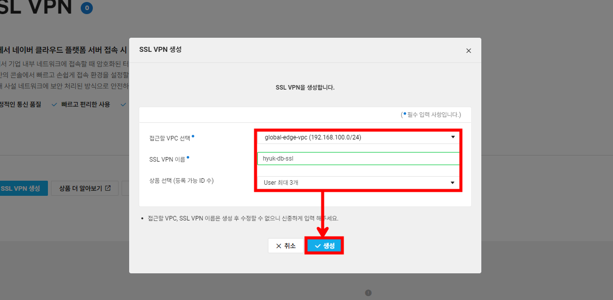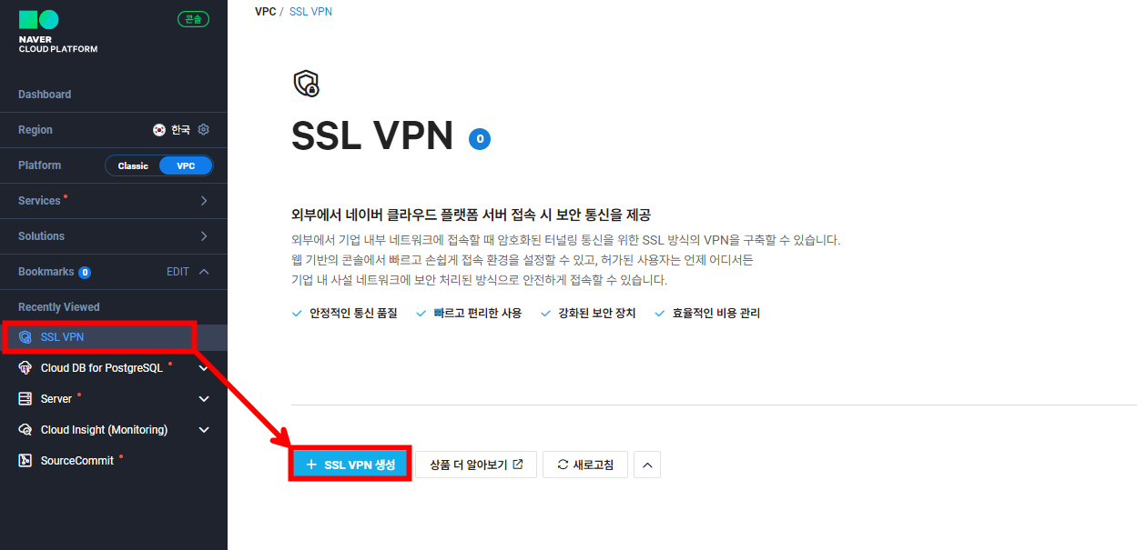외부에서 생성할 DB 서버에 접근하기 위해 [SSL VPN을 생성]합니다.