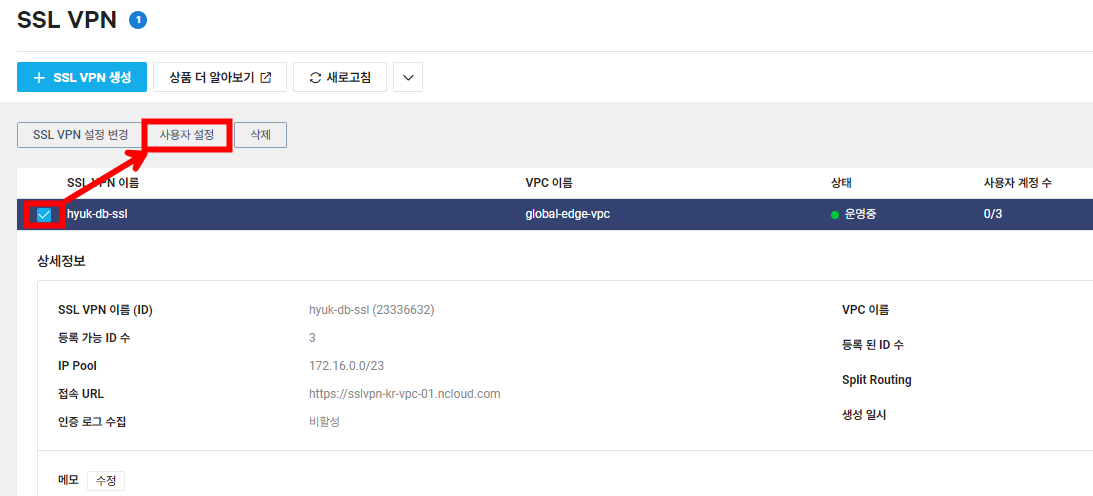 SSL VPN을 사용할 수 있는 사용자를 지정하기 위해 해당하는 SSL VPN을 선택한 후 [사용자 설정]을 선택합니다.