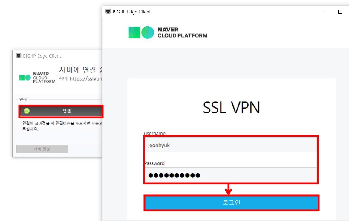 [BIF-IP Edge Client]에 접속하면 앞서 설정했던 SSL VPN의 유저와 패스워드 입력이 나옵니다.