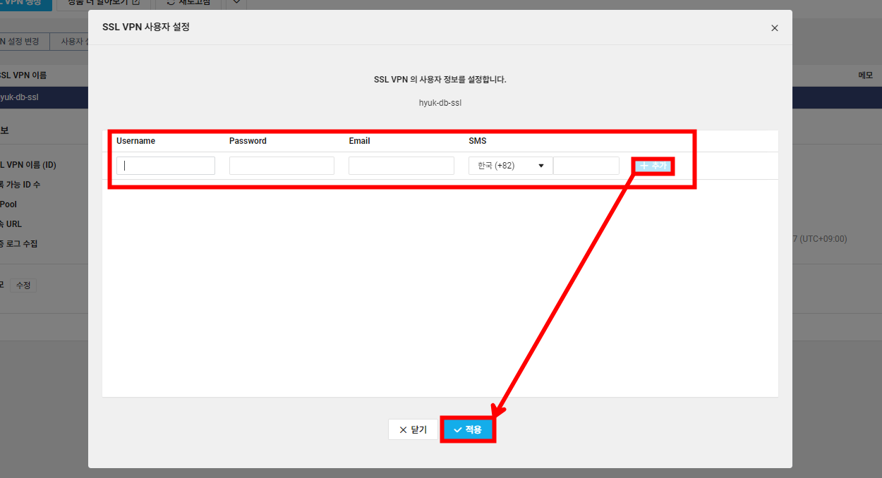 SSL VPN에 로그인할 사용자 이름과 패스워드 그리고 OTP 번호를 전달받을 휴대폰 번호를 입력하고 [추가] 합니다.