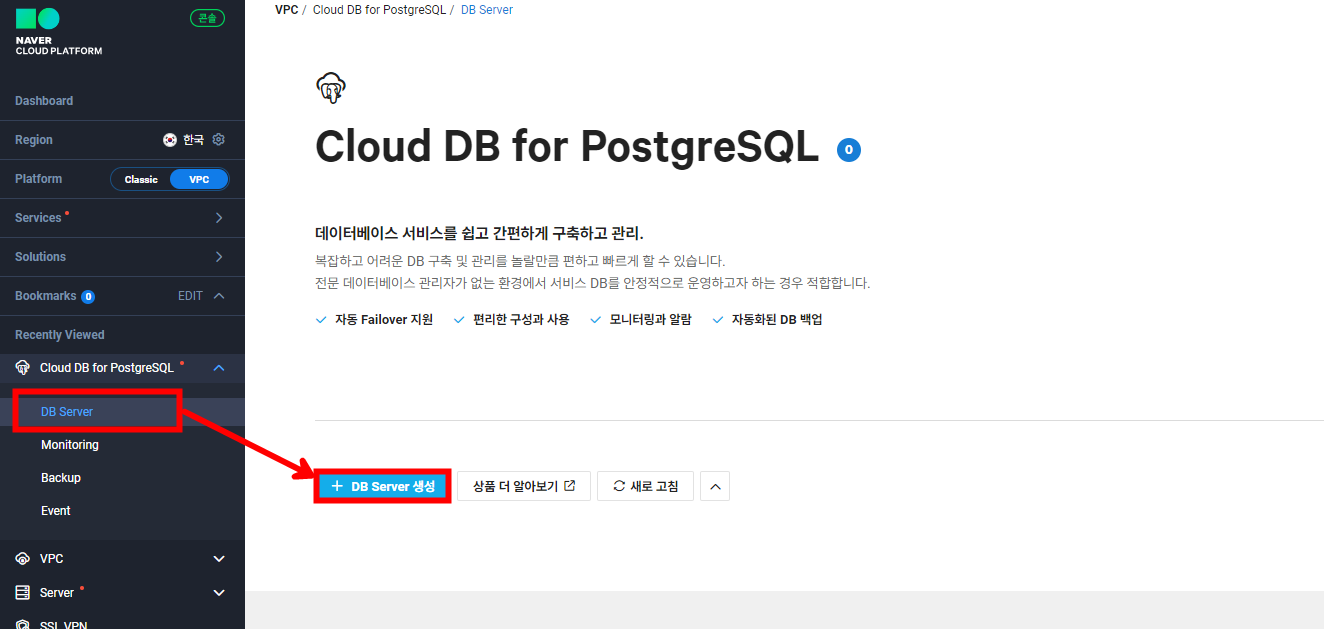 외부에서 접속할 수 있게 끔 사전 세팅을 했으니 이제 DB 서버를 생성해야 합니다. CDB for PostgreSQL에 들어온 후 DB Server - [DB Server 생성]을 눌러줍니다.