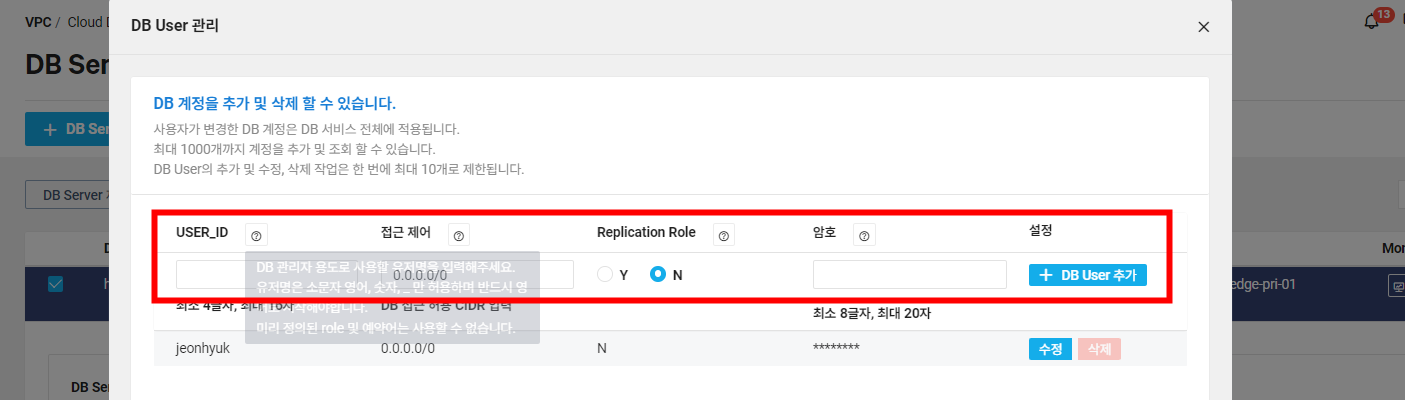 여기서 DB에 접속 가능한 유저를 생성하면 됩니다. CDB for MySQL과 다르게 권한 설정인 DDL, DML, DCL 등의 설정은 따로 없는 모습입니다. 따로 설정해주지 않아도 기본적으로 권한을 갖고 있는 것 같습니다.