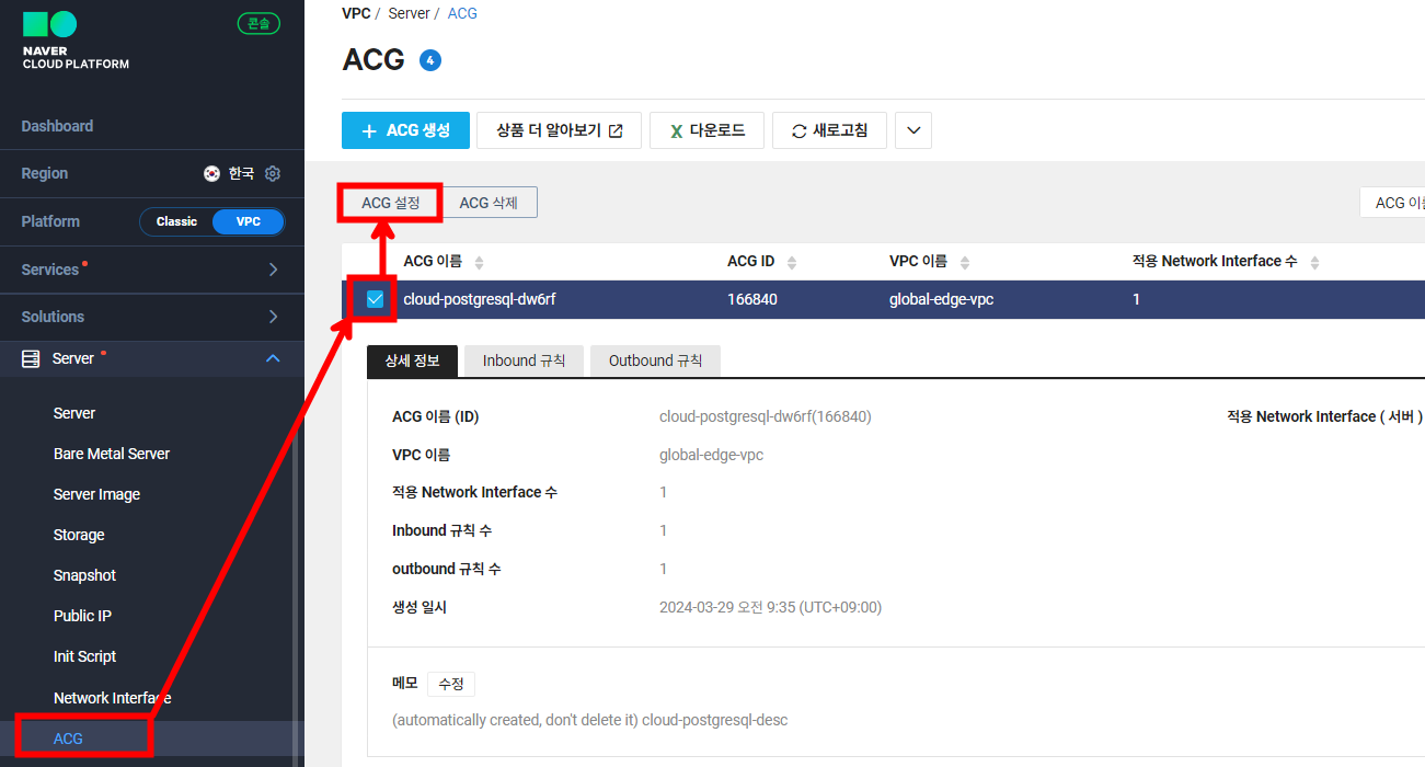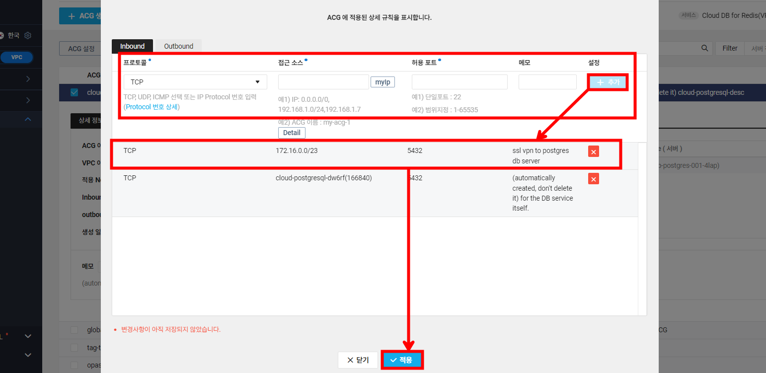 SSL VPN에서 해당 DB 서버에 접속할 수 있도록 하기 위해 DB 서버의 ACG에서 SSL VPN 대역과 5432 포트를 허용해 줍니다.