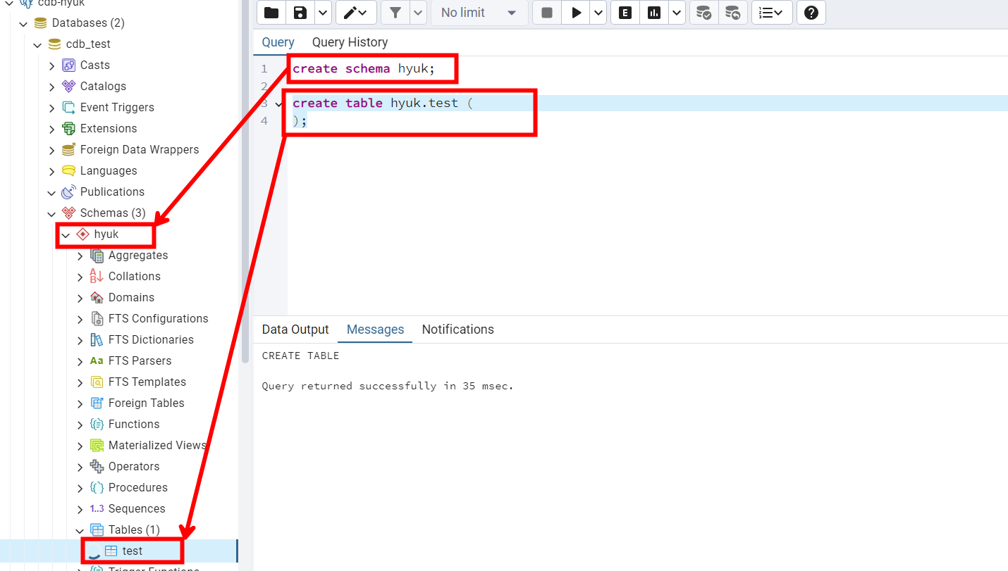 다음과 같이 SQL 쿼리를 이용해서 스키마 및 테이블을 생성할 수 있습니다.