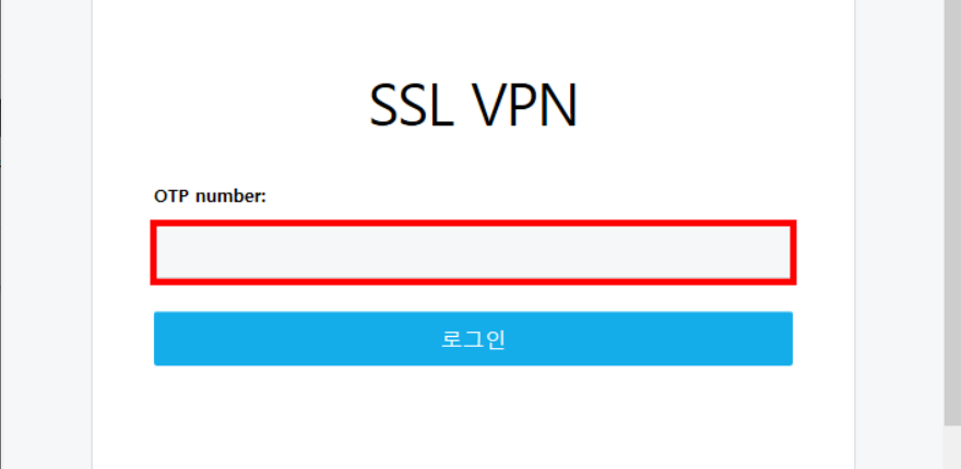 다음으로 설정한 휴대폰 번호에 온 OTP 번호를 입력한 후 로그인하면 SSL VPN에 접속하실 수 있습니다.