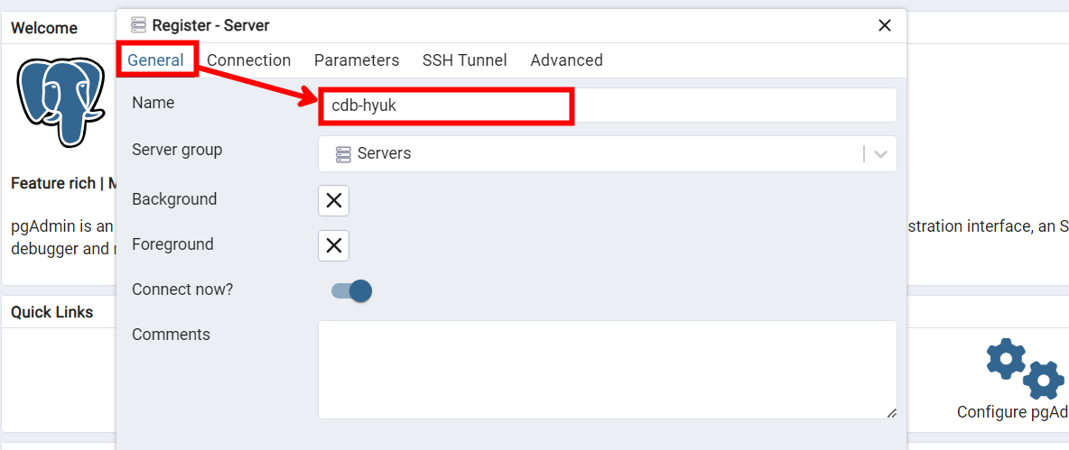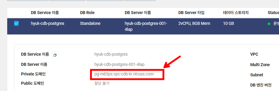 Ncloud 콘솔에서 DB 서버의 Private 도메인을 복사해 준 후에 다시 pgAdmin4로 돌아옵니다.