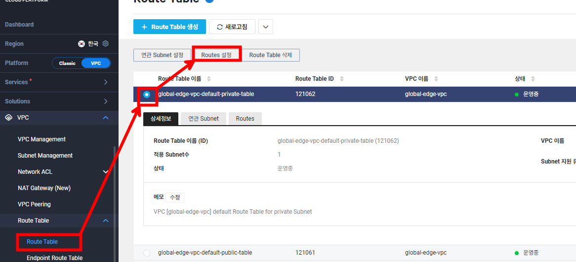 다음과 같이 VPC - Route Table - [Route Table] - Private Subnet(DB 서버가 올라갈 서브넷) 선택 - [Routes 설정]을 눌러줍니다.