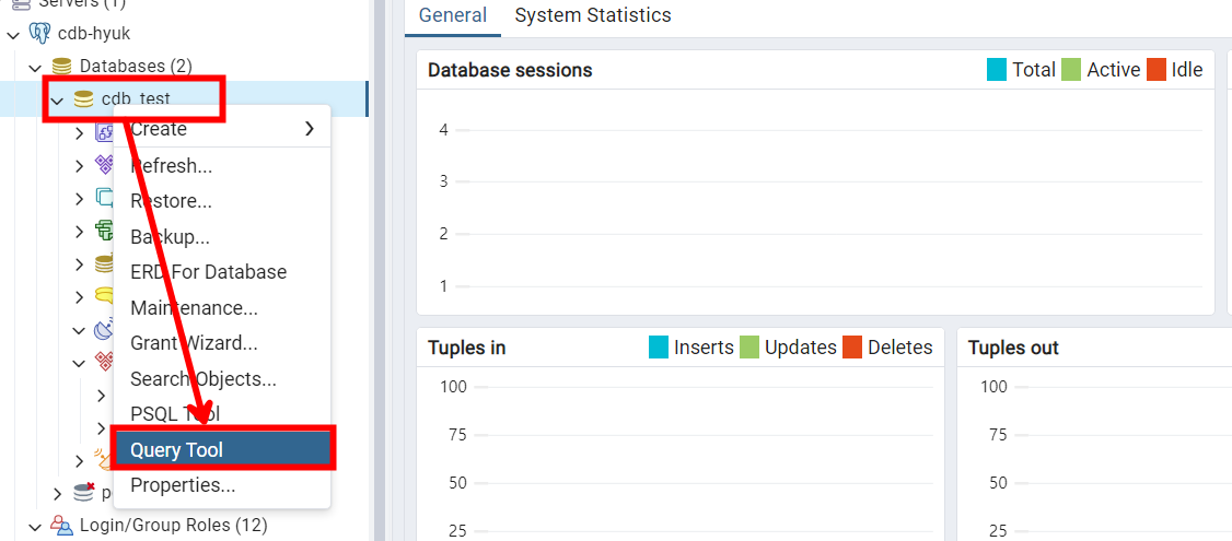DB를 우클릭한 후 [Query Tool]을 이용하면 SQL문을 사용하실 수 있습니다. 기본적으로 DB 유저는 소유한 DB나 접근 가능한 DB에서만 권한을 갖습니다. (마스터 권한을 갖지 않음)
