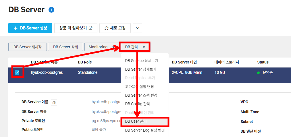 기본적으로 해당 DB에 접속하기 위해서는 해당 DB에 User를 추가해주어야 합니다. 다음과 같이 DB 관리 - [DB User 관리]를 선택합니다.