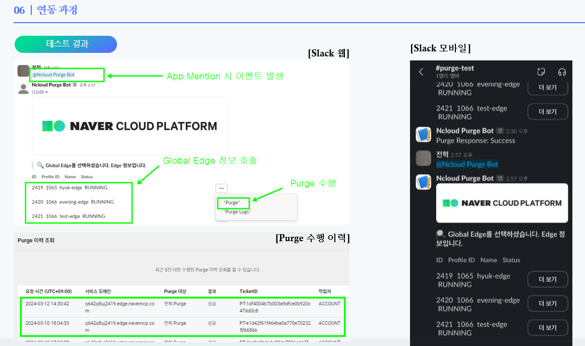 아쉬웠던 점은 현재 모바일 Ncloud 콘솔에서는 해당 Purge 기능을 사용할 수 없었고 기능적인 제약이 많아서 Slack에서 구성해 보자라는 생각을 갖게 되었고 콘솔에 들어오는 공수를 줄이는 기능을 구성하게 되었습니다.