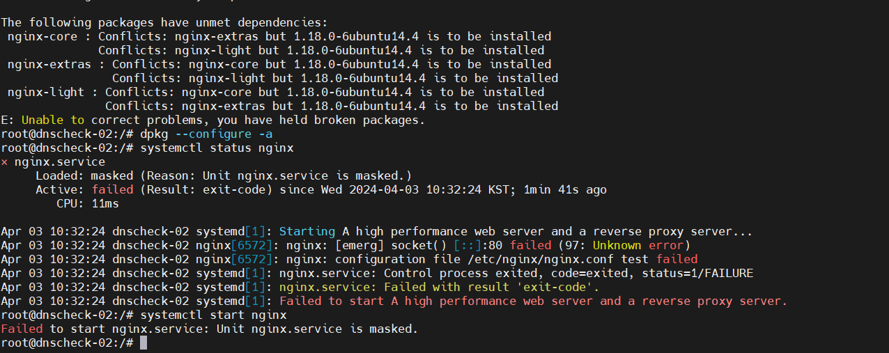 이 경우 nginx를 제거하고 다시 설치합니다. nginx*를 통해 필요한 nginx 관련 패키지까지 같이 설치합니다. dkpg --configure -a로 종속성 문제가 해결되었는지 확인합니다.