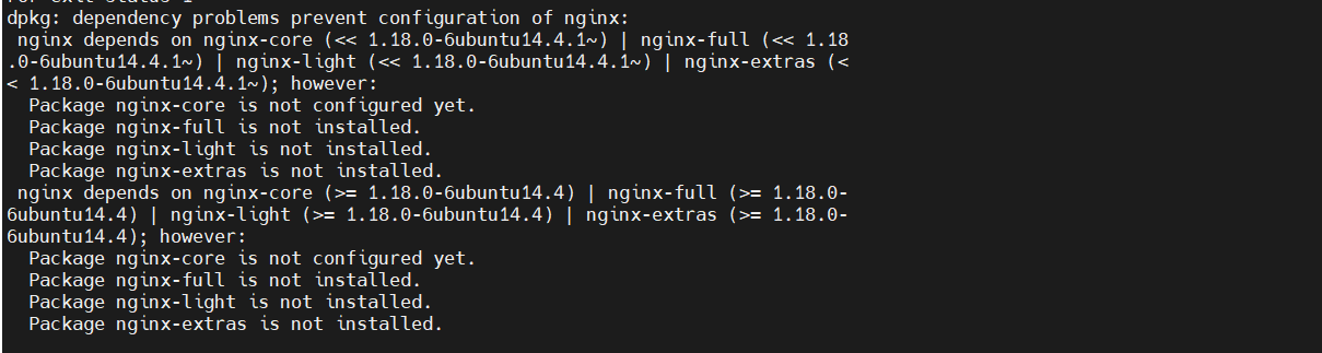 nginx depends on nginx-core (<< 1.18.0-6ubuntu14.4.1~) | nginx-full (<< 1.18 .0-6ubuntu14.4.1~) | nginx-light (<< 1.18.0-6ubuntu14.4.1~) | nginx-extras (< < 1.18.0-6ubuntu14.4.1~); however: