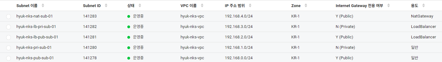 | hyuk-nks-lb-pri-sub-01 | 192.168.3.0/24 | Private | LoadBalancer |