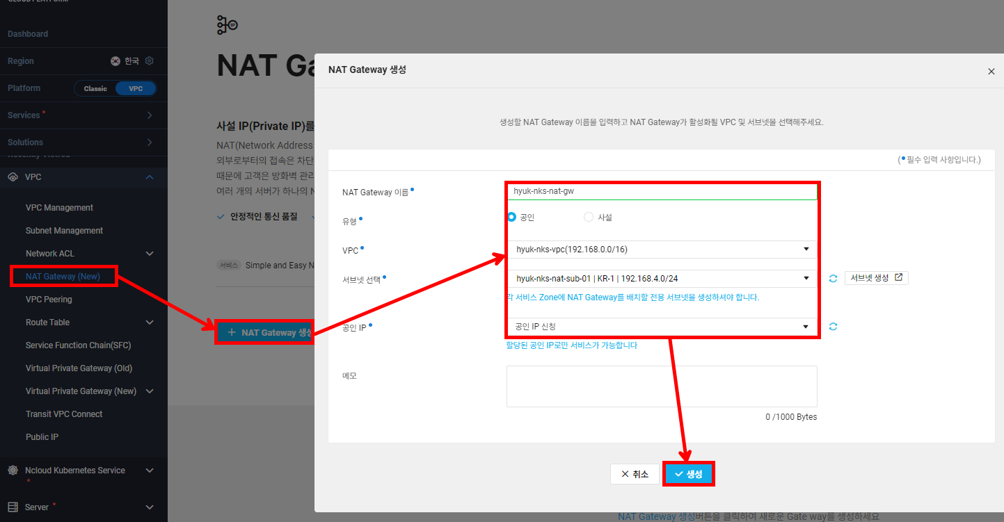 | hyuk-nks-nat-sub-01 | 192.168.4.0/24 | Public | NatGateway |