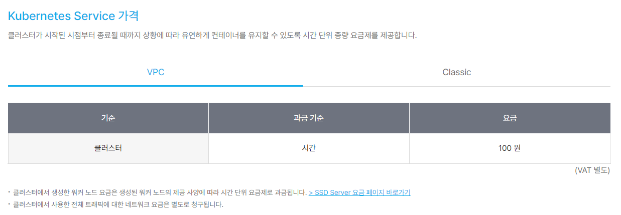 NKS는 기본적으로 클러스터 비용이 시간당 100원 과금되고 생성한 워커 노드(서버) 제공 사양에 따라 추가적인 요금제로 과금됩니다. 서버 운영에 클러스터 비용이 추가된다고 생각해 주시면 됩니다.