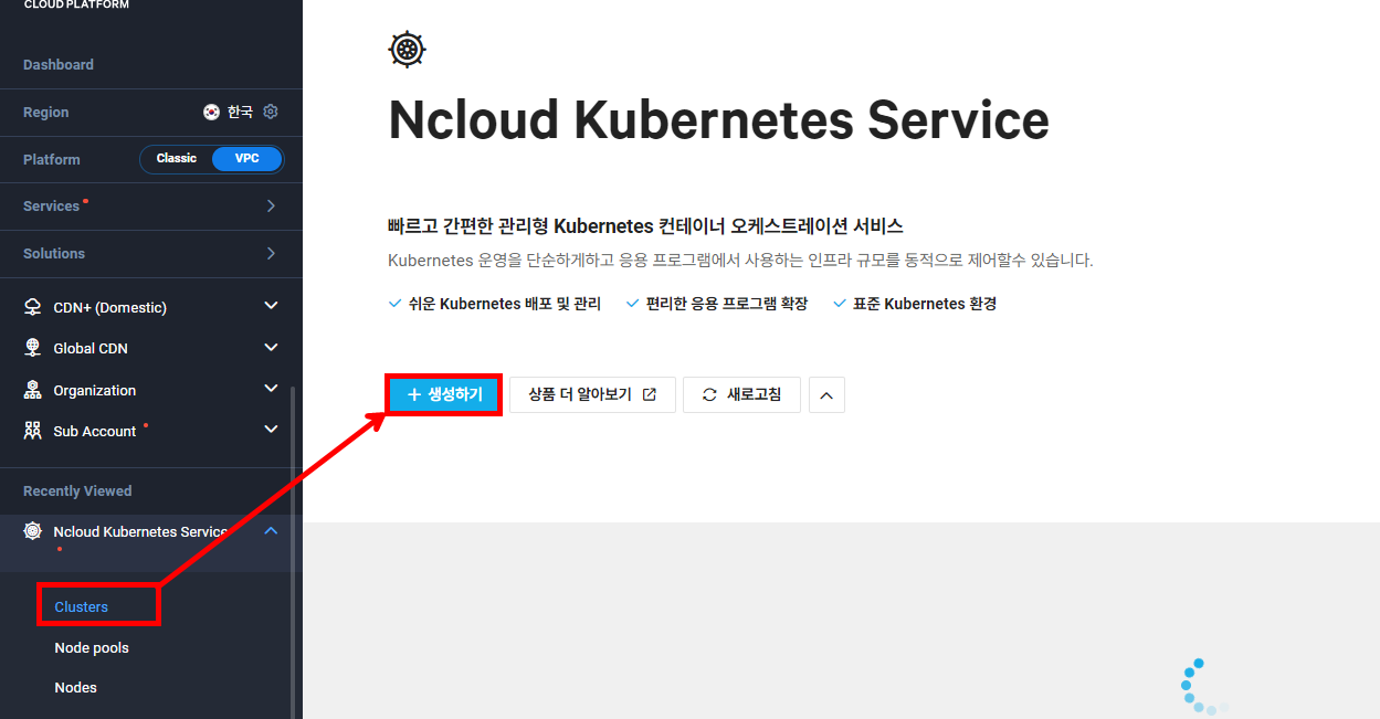 Ncloud Kubernetes Service - Clusters - [생성하기]를 눌러 클러스터를 생성합니다.