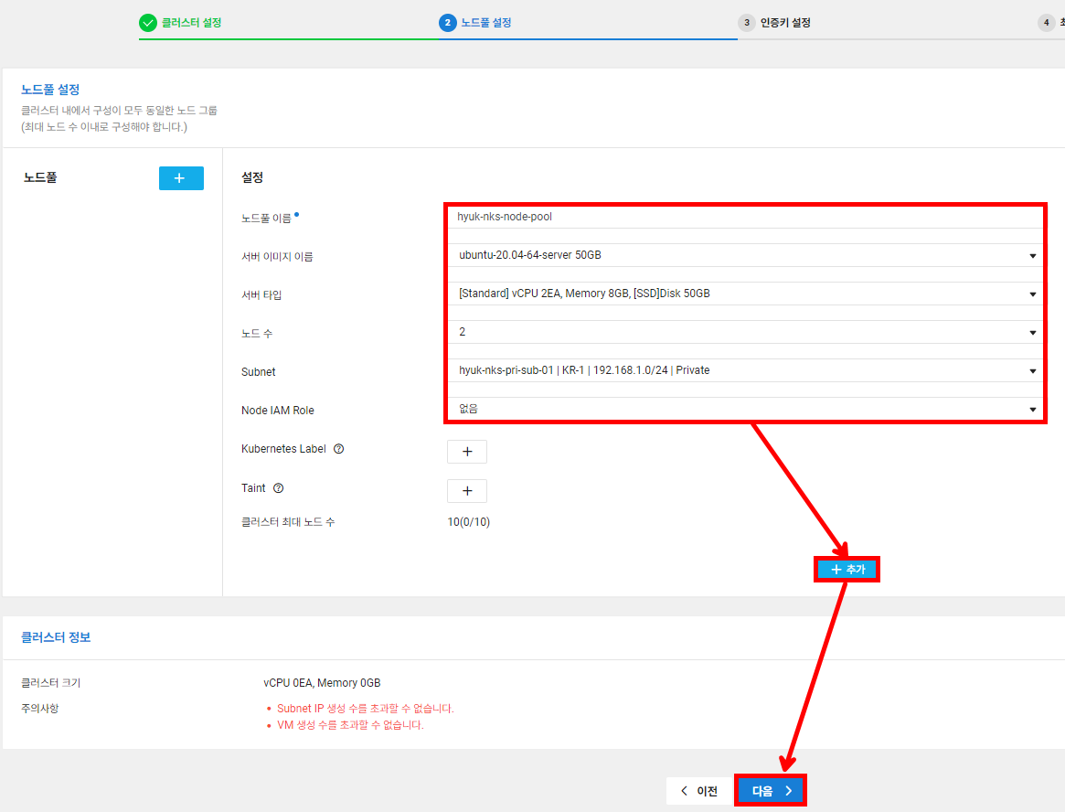 노드풀 설정 시 필요한 노드들을 추가할 수 있는데 서버 이미지로 SourceBuild와 동일하게 ubuntu로 설정 가능하고 버전은 현재 기준으로 20.04, 18.04 버전을 사용할 수 있습니다. 저는 테스트로 노드 2개를 생성하겠습니다.