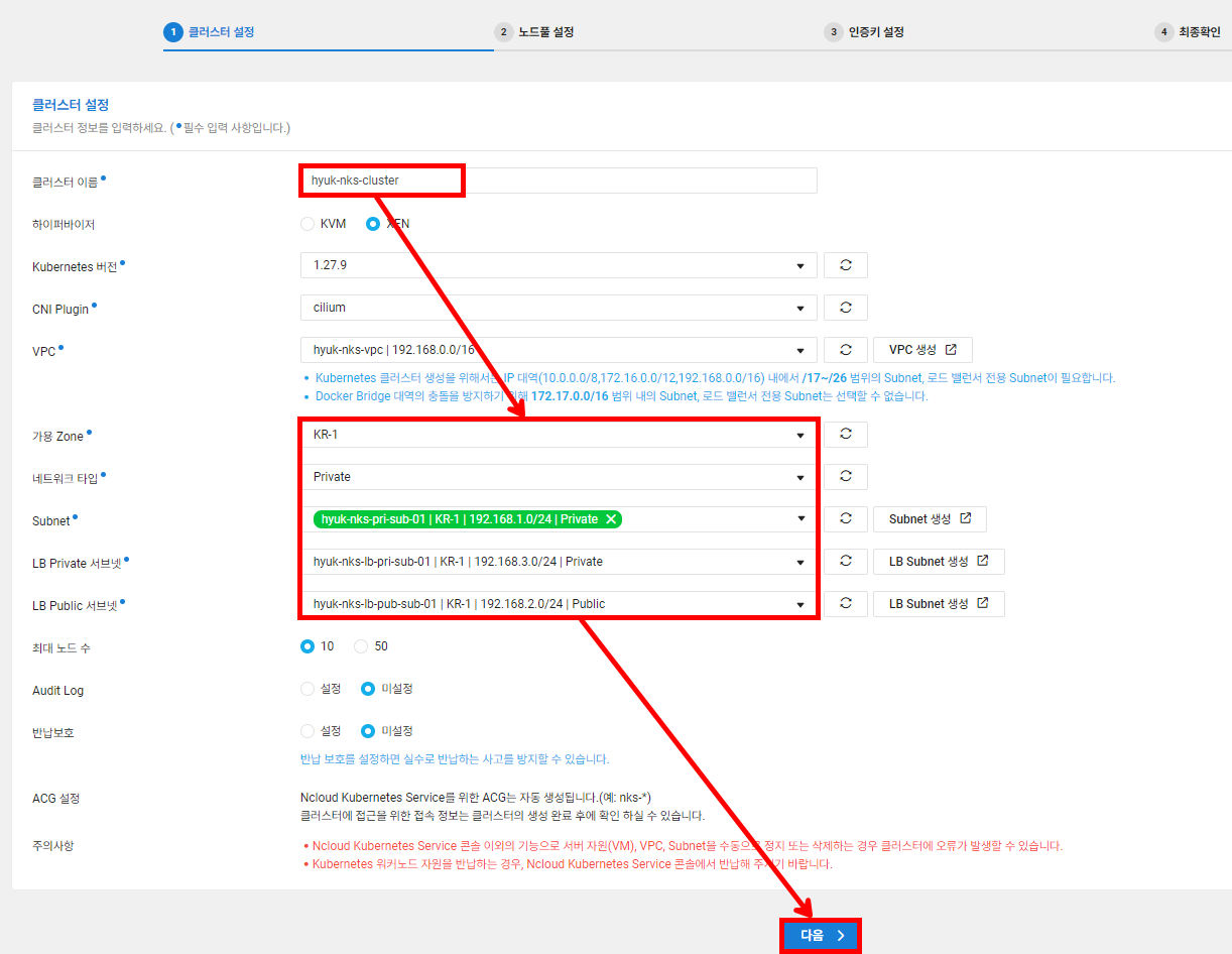 기본적으로 앞에서 서브넷을 생성하면 클러스터 생성 시 자동으로 서브넷이 잡히기 때문에 클러스터를 Public에 둘지 Private에 둘 지만 선택해 주시면 됩니다.