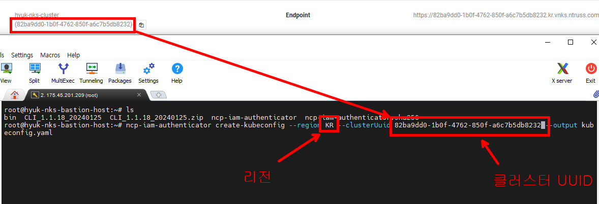 다음과 같이 필수 파라미터인 리전과 클러스터 UUID를 입력하여 kubeconfig.yaml 파일을 생성합니다.