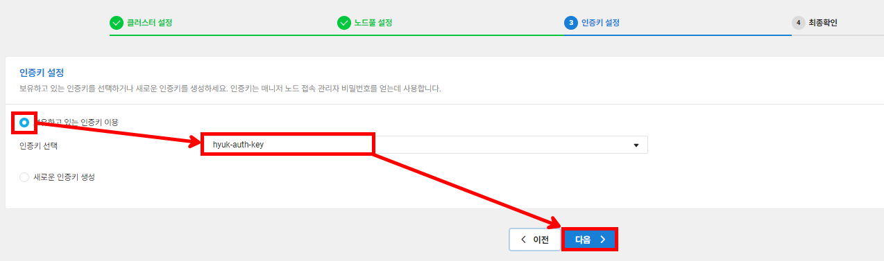 인증키를 생성하시거나 보유 중인 인증키를 사용해서 클러스터를 생성해 줍니다. 클러스터 생성에 시간이 꽤 소요되기 때문에 기다립니다.