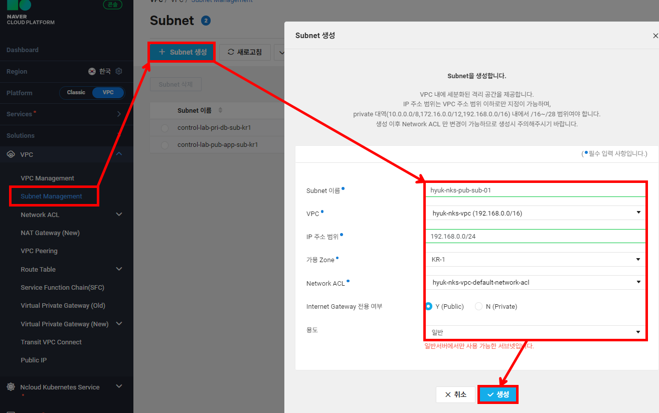 | hyuk-nks-pri-sub-01 | 192.168.1.0/24 | Private | 일반 |