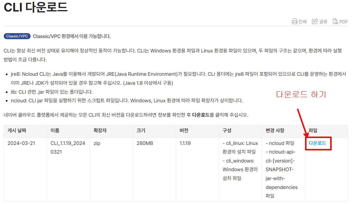 위 Ncloud CLI 공식 홈페이지에서 다음과 같이 Ncloud CLI 파일을 다운로드합니다.