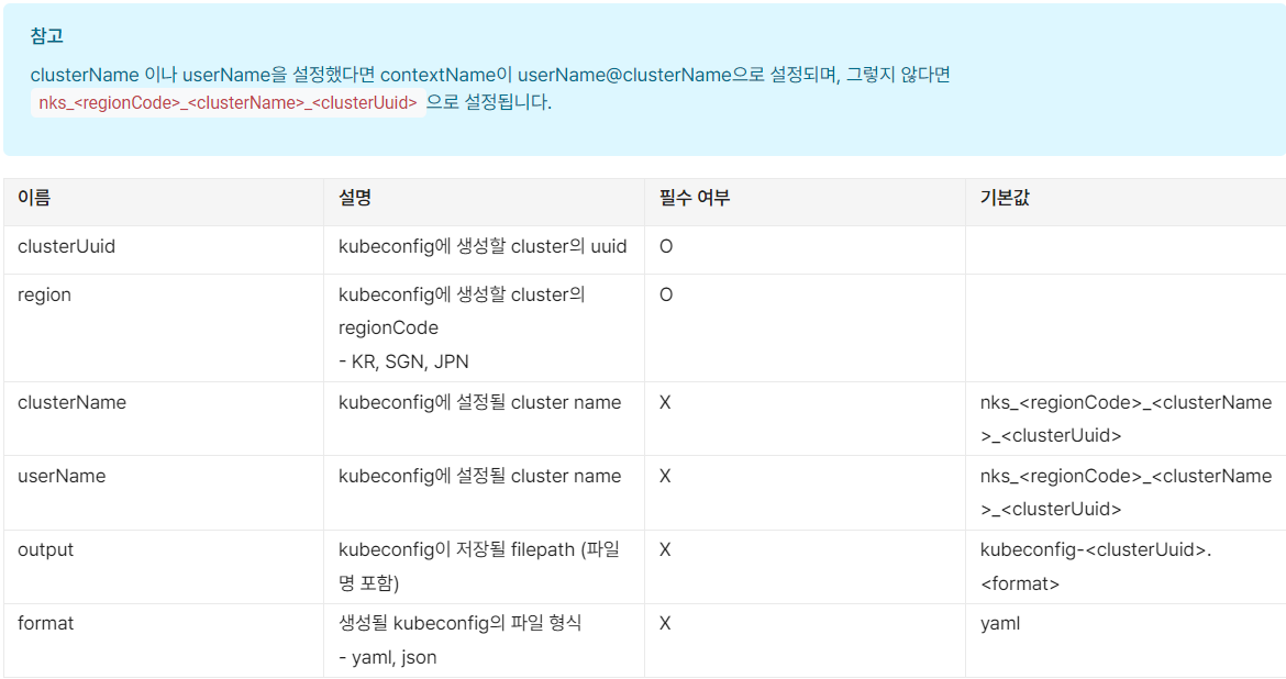 (3) 위 표를 참고해, ncp-iam-authenticator create-kubeconfig 명령을 사용하여 클러스터에 대한 kubeconfig를 생성해 주십시오.