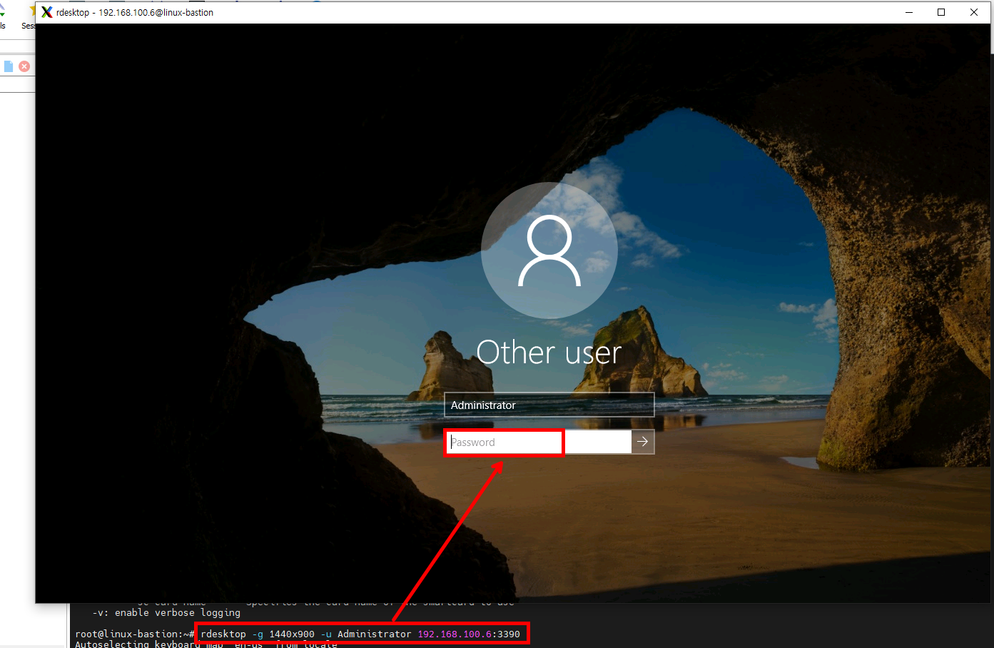 rdesktop -g 1440x900 -u Administrator remoteWindowsAddr:Port