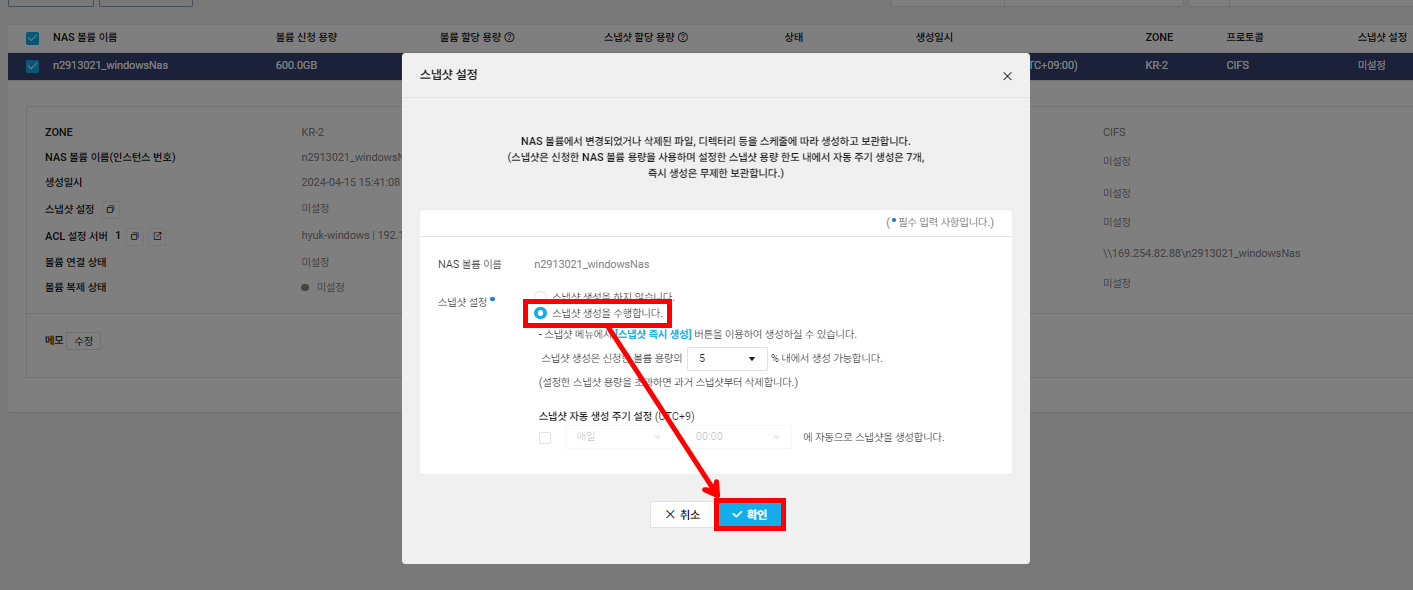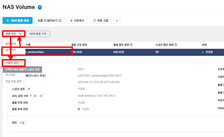다음과 같이 스토리지 선택한 후 [볼륨 설정] - [스냅샷 설정]을 선택하여 스냅샷을 설정합니다.