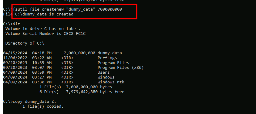 fsutil을 이용하여 6GB가 조금 넘는 용량의 더미 파일을 C: 드라이브 아래에 생성합니다.